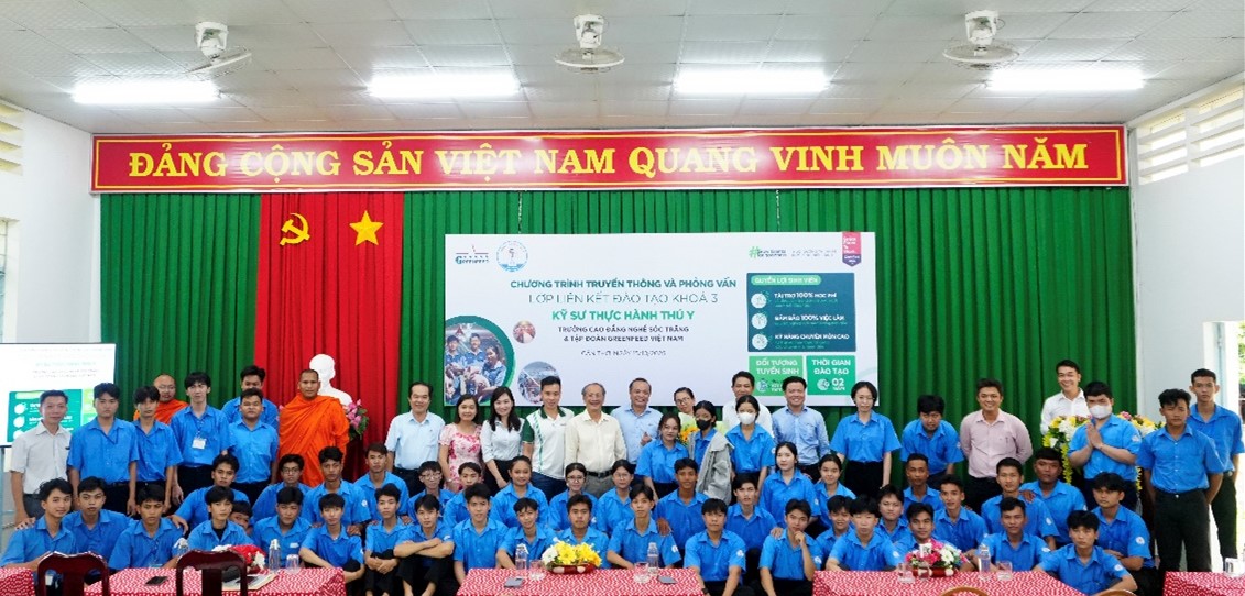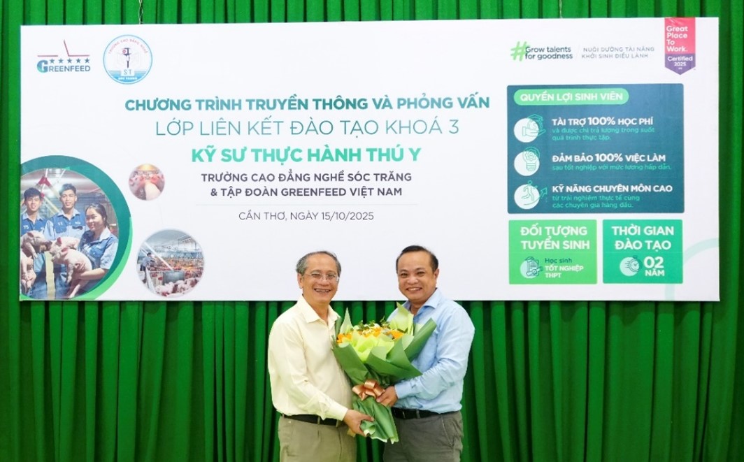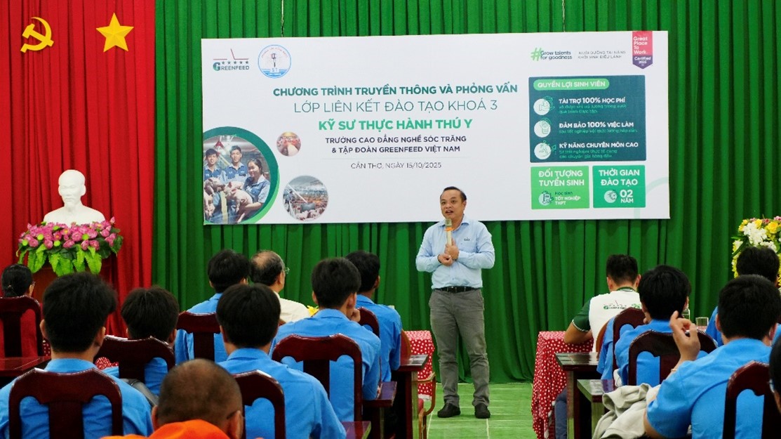 Chiều ngày 15/10/2025, tại Trường Cao đẳng Nghề Sóc Trăng, đã diễn ra chương trình truyền thông và phỏng vấn tuyển sinh cho lớp liên kết đào tạo Kỹ sư Thực hành Thú y Khóa 3. Sự kiện đánh dấu sự tiếp nối của mô hình hợp tác chiến lược giữa Nhà trường và Tập đoàn GreenFeed Việt Nam, thu hút sự tham gia của 45 sinh viên Cao đẳng Nghề Thú y đầy nhiệt huyết.
